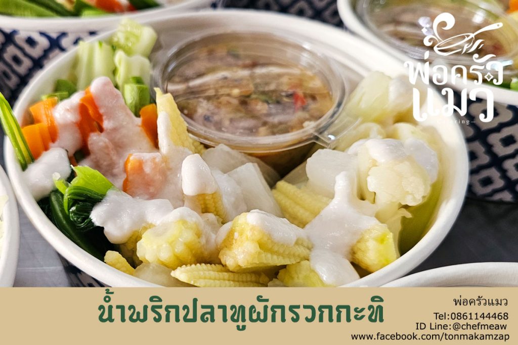 - น้ำพริกปลาทู + ชุดผักสดและผักลวกราดหัวกะทิ: เมนูคู่บุญที่ขาดไม่ได้ จัดเต็มด้วยเครื่องเคียงและกะทิหอมมัน